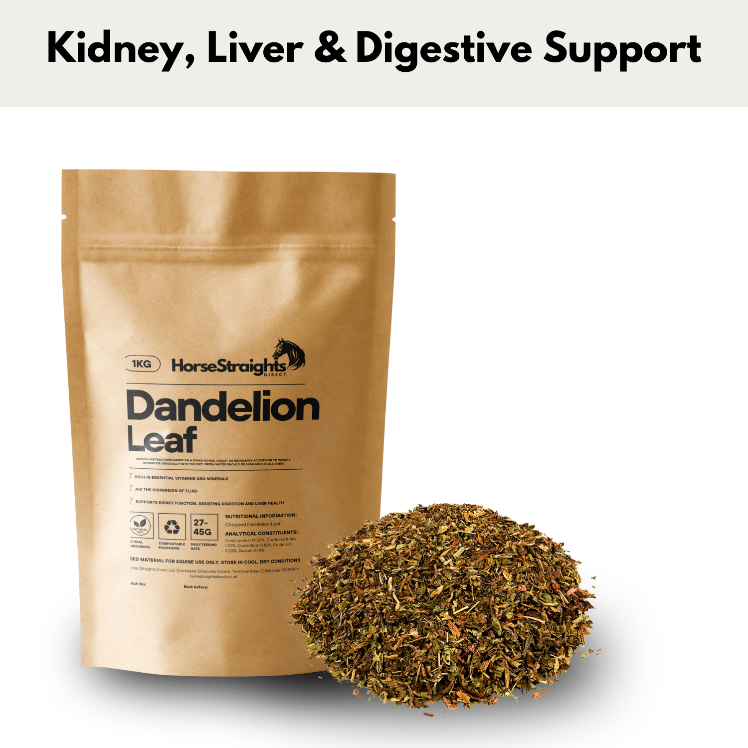 Dandelion Leaf Chopped For Horses 100% Natural Horse Supplement. Premium Quality Horse Herbs Equine Supplements in 100% Compostable Packaging