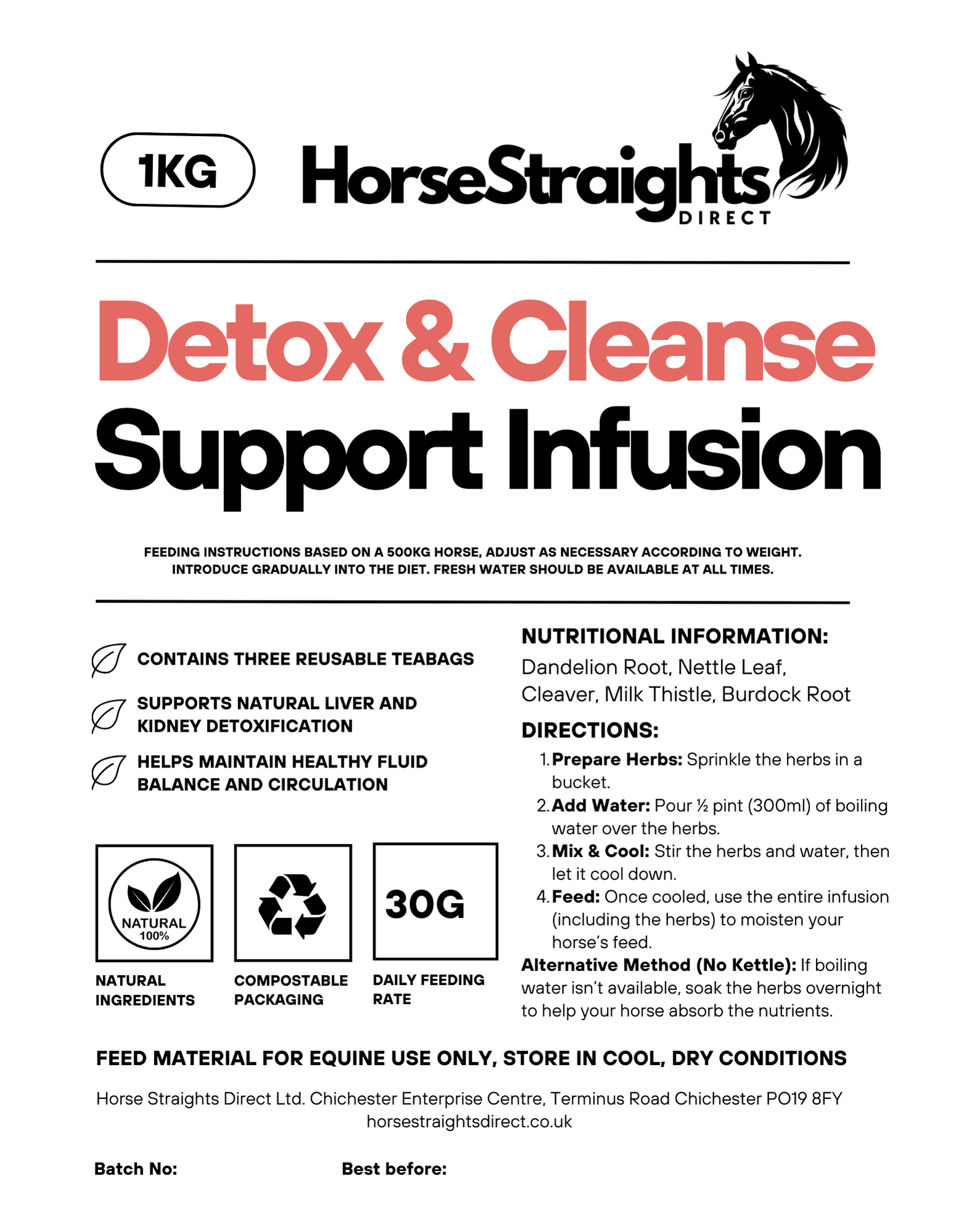 Our carefully balanced herbal blend is designed to naturally support your horse’s internal cleansing processes. This infusion combines traditional detoxifying herbs to help maintain healthy liver and kidney function, support fluid balance, and promote overall vitality. Ideal for use during seasonal changes, after rich grazing, or as part of a routine wellbeing programme, it offers gentle yet effective nutritional support.